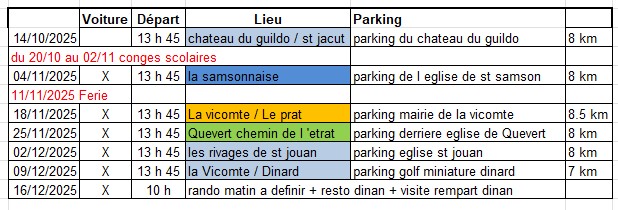 Le rendez-vous a lieu à 13h45 devant la salle omnisports le mardi. La durée est d’environ 2h30, entre 13h45 à 17h00. Les parcours sont différents d’une semaine à l’autre. Ils se situent autour de Pleurtuit ou en bord de mer. Pour les personnes qui souhaitent des rythmes de marche plus lente, le rendez-vous est fixé au même endroit à la même heure, un parcours plus court est proposé sur le site du jour. Une fois par trimestre une sortie est organisée sur la journée.